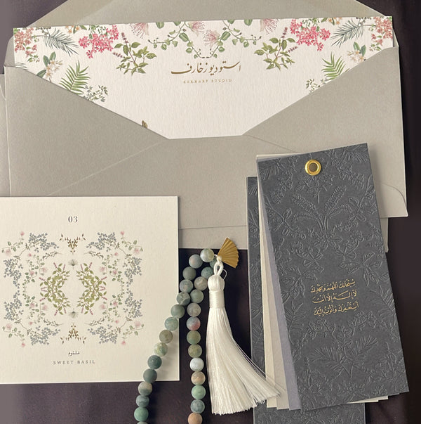 Prayer dress, Athkar, Mesbah (33 beads), and a greeting card.